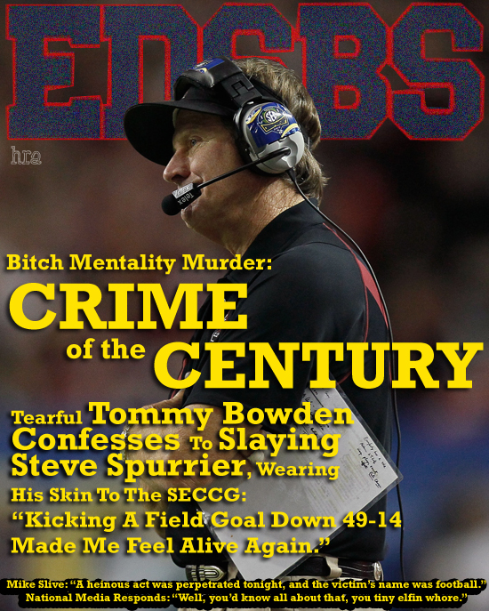 Some may disagree with this thought pattern, as I've had people look at me crazily when I say what I'm about to say, but it's a philosophy I believe in and I contend that the most intense competitors do also. When you're getting defeated the way we were yesterday, you don't kick field goals down 49-14. You try to score touchdowns. You go for it on fourth down in all but the most ridiculous circumstances, and you might go for it then, too. You don't play games to make the score look better. You play to win. And, if you're getting beat up and down the field, you don't quit. You don't stop a relentless effort for victory until the clock stops, no matter how futile. Sure, in all likelihood we were going to experience defeat last night, but by God you do not concede that defeat until it is forced upon you. You throw, throw, throw. If you score a touchdown, boot an onside kick. Do it again. Then do it again. Do it til they stop you. Do it til the clock hits zeros. It's Jimmy V week on ESPN, and Steve Spurrier should have paid attention to the central message: "Don't give up. Don't ever give up." Kicking field goals and playing second teamers is for quitters. Utilizing my philosophy last night may have resulted in a 63-14 loss, or worse, but, damnit, I'd have woke up this morning knowing I didn't stop trying until it was time to leave the field.